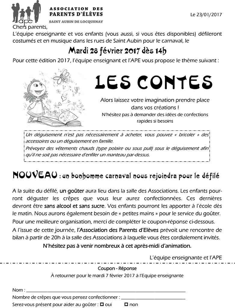 28/02/2017 14:00L’équipe enseignante et vos enfants (vous aussi, si vous êtes disponibles) défileront costumés et en musique dans les rues de Saint Aubin pour le carnaval.